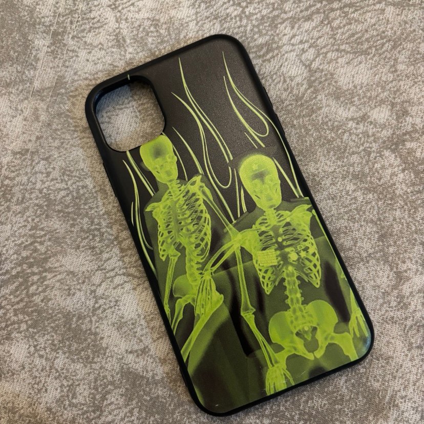 Kılıf siyah renkte, yeşil parlayan iskelet ve alev desenlerine sahip gotik bir tarzdadır. Telefon modelimi yükselttiğim için satıyorum, kullanıma bağlı olarak kılıfın iç kısmında hafif deformeler mevcuttur görselden bakabilirsiniz.