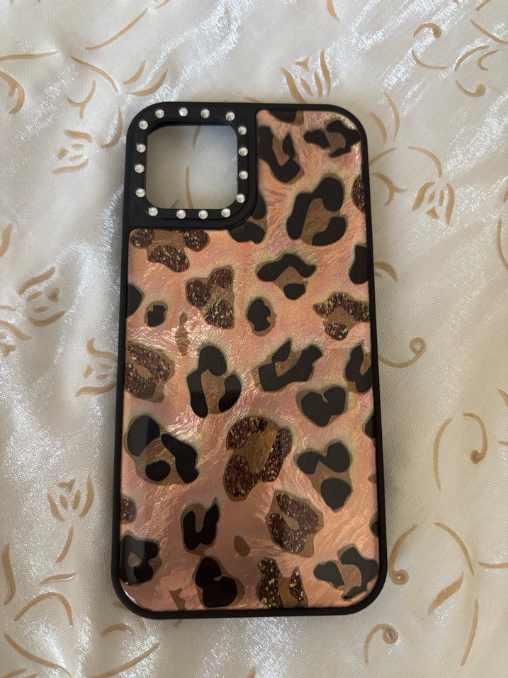 İPhone 12 sıfır kullanılmadı Kahverengi leopar desenli, pul detaylı ve kamera çevresi metal süslemeli bohem tarzda telefon kılıfı.