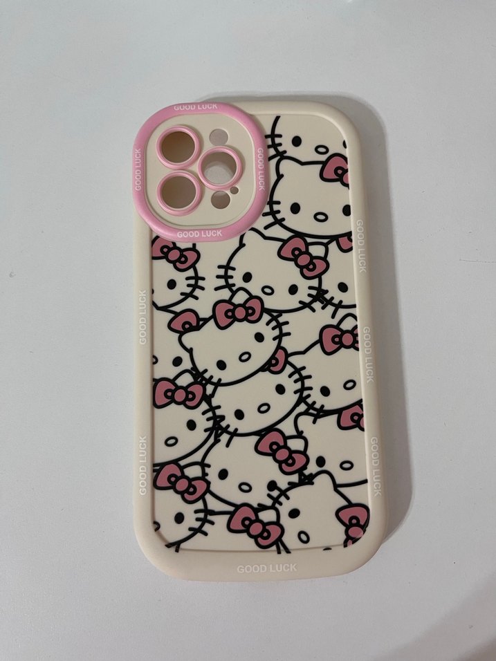 Pastel pembe renkte, çoklu Hello Kitty yüzleri ve fiyonk desenleriyle pop kültür tarzında telefon kılıfı. Kamera çerçevesinde de pembe fiyonk var.