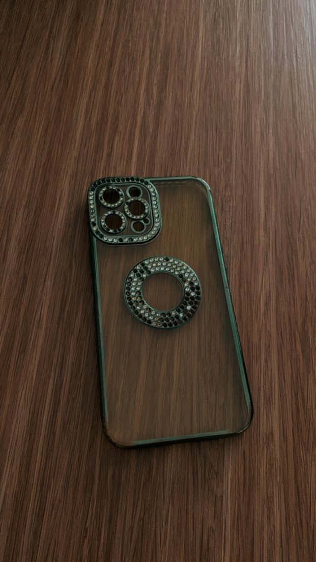 Şeffaf dokulu kenarları koyu yeşil taşlı 12 pro Max uyumlu telefon kılıfı görselde gozuktugu gibi taşları düşmüştür fiyata yansiyacaktir
