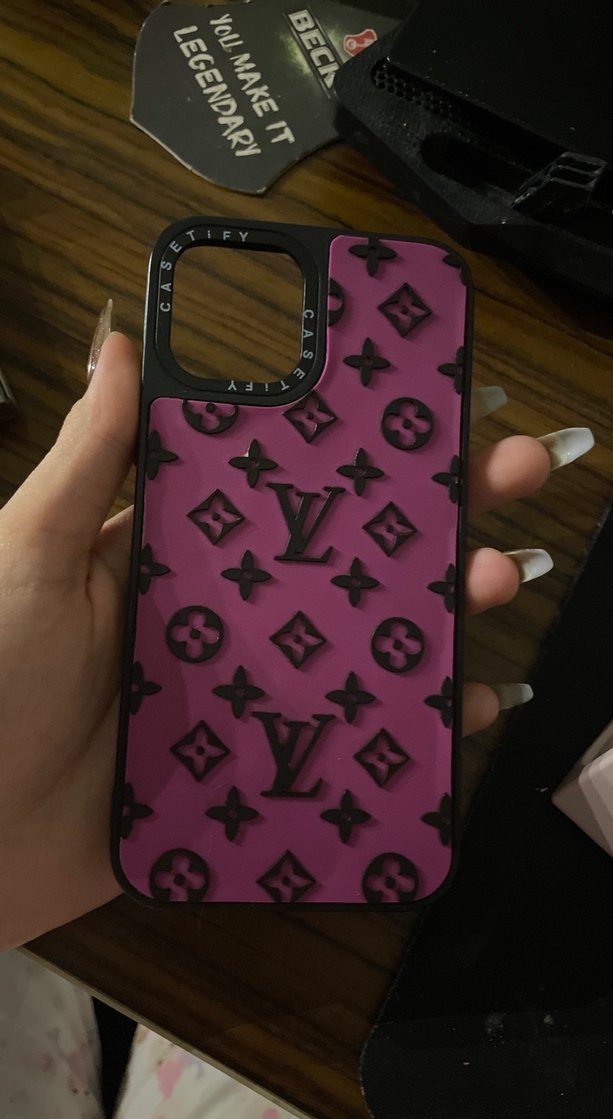 Parlak koyu pembe renkte, kabartmalı desenli counterculture tarzı telefon kılıfı