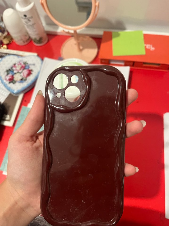 Parlak koyu tonlu, kamera kesikli ve kenarları dalgalı tasarımlı telefon kapağı .