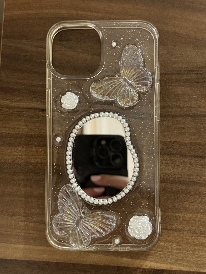 Bej renkte, payetli kelebek ve çiçek detaylı, inci çerçeveli dekoratif aynası olan bohem tarzda telefon kılıfı.