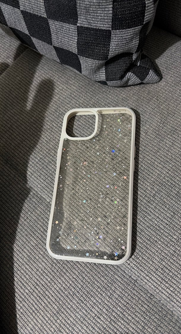 Gri renkli telefon kılıfı, küçük yıldız simleriyle parlak bir tasarıma sahip. Şeffaf arka yüzey ve dayanıklı kenarları bulunuyor. ✨