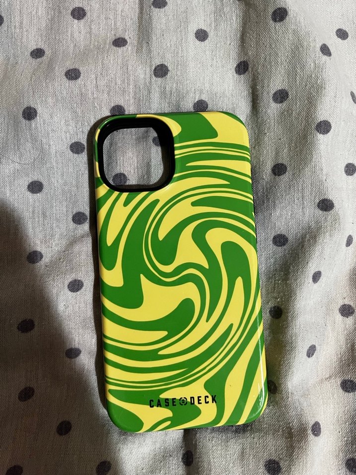 Yeşil renkte, parlak yüzeyli ve canlı gri tonlarda dönen counterculture desenli telefon kapağı. Arka kısmında CASECDECK yazısı bulunur.