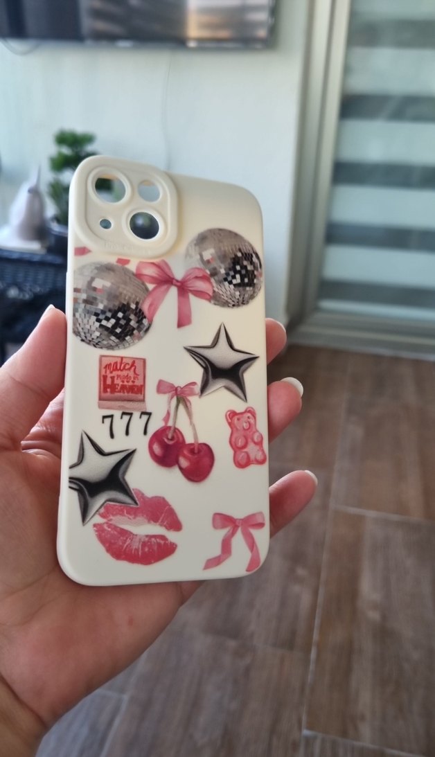 Parlak yüzeyli pembe telefon kılıfı, kiraz, dudak, yıldız ve disko topu gibi pastel pop kültür çıkartmaları içerir. Telefonu sıkıca sarar ve eğlenceli bir görünüm sağlar.