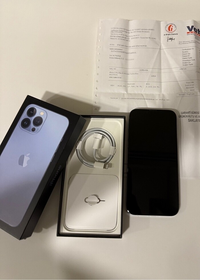 Apple Iphone 13 Pro Max 512 Gb , RENK: Mavi Fotoğraflar da göründüğü gibi kablosu sifirdir her detayila sifir ürün ve yerli cihaz temiz ve az kullanılmıştır her hangi bir çizik bile yoktur Fatursı da mevcuttur