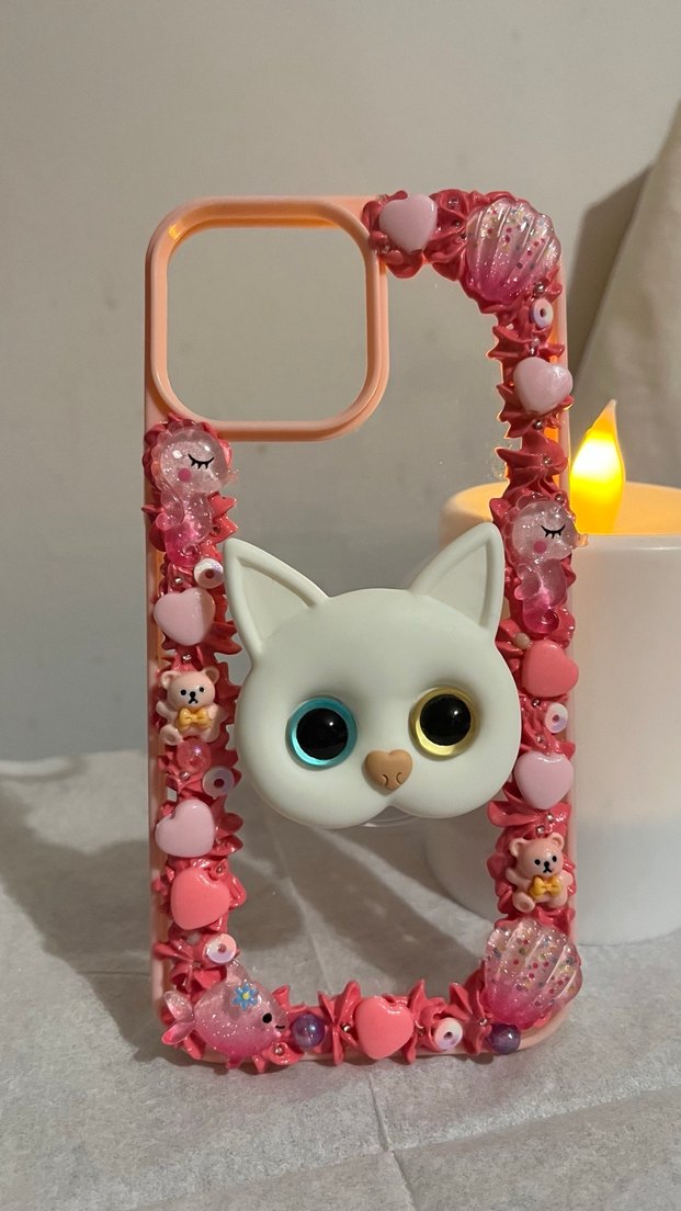 Pembe pastel renkli bu telefon kılıfı, kalpler, deniz kabukları ve oyuncak ayılarla süslenmiş boncuklu detaylara sahiptir. Ortasında renkli gözlü 3D kedi yüzü bulunur. Kedili tutma standı bulunan Iphone 13 Pro max içim uygun telefon kılıfı tamamen el emeği ile üretilmiştir Kore tarzını yansıtmaktadır