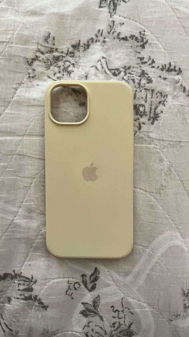 Krem/sarı renk tonlarında logolu iphone 13 silikon lansman telefon kılıfı.