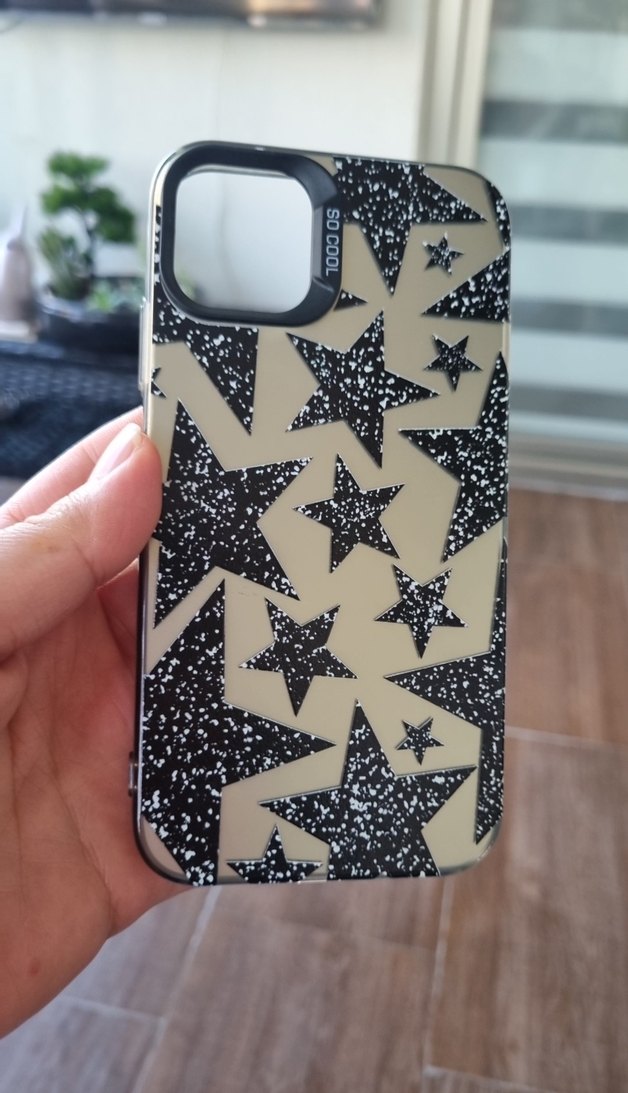 Siyah renkte, parlak yıldız desenli, street wear tarzında telefon kılıfı.