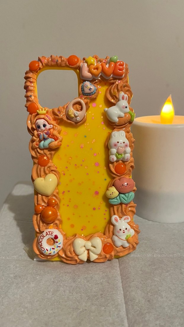 Sarı renkte, boncuklu ve pop kültür temalı sevimli hayvanlar, tatlılar ve eğlenceli süslemelerle dekore edilmiş telefon kılıfı. Ürünler Kore tarzını yansıtıp tamamen el emeği ile üretilmiştir iPhone 14 ile uyumludur