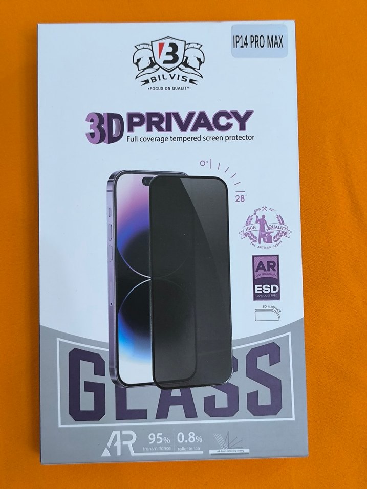 Sıfır ürün.iPhone 14 Pro Max için 3D gizlilik sağlayan, tam kaplama temperli cam ekran koruyucu. Yansıma önleyici ve statik önleyici özelliklere sahip, %95 şeffaflık ve 0.8 mm kalınlıkta.
