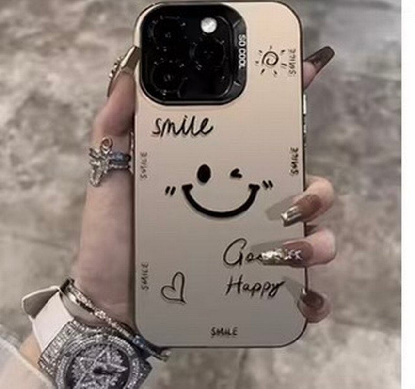 Parlak bej ve gri renkte, karşı kültür tarzında telefon kapağı. Gülümseme ve 'smile', 'Go Happy' gibi el yazısı detayları içerir.