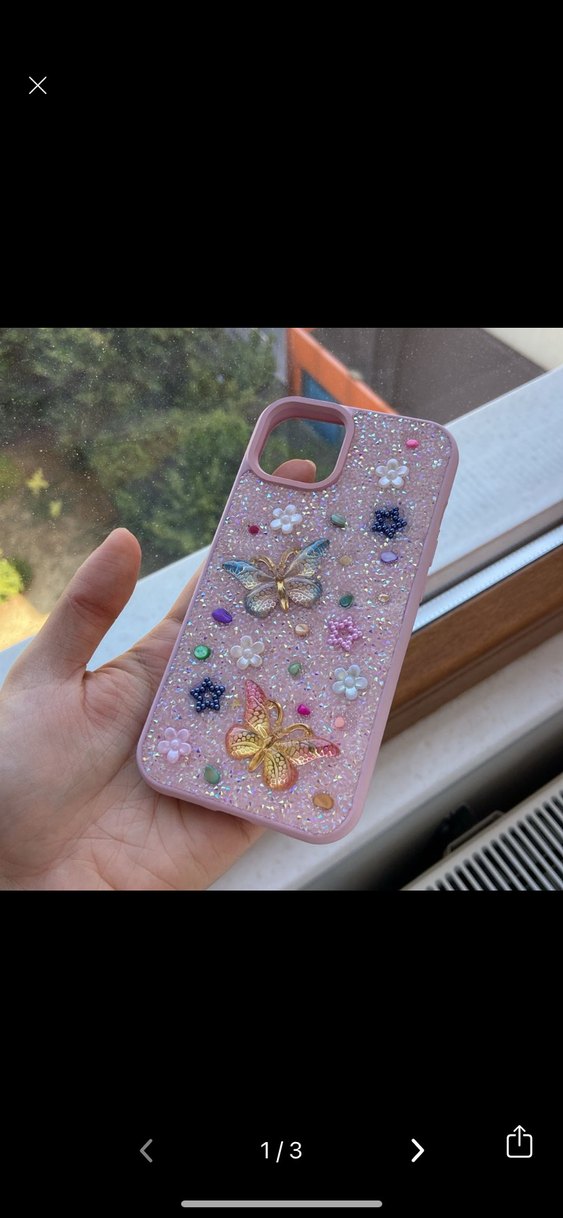Pastel pembe renkte, payetli detaylara sahip bohem tarzda kelebek ve çiçek süslemeli telefon kılıfı. Telefonunuzu korurken şık bir görünüm sağlar.
