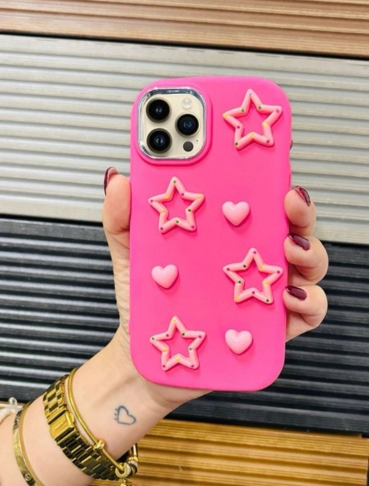 Parlak pembe renkte, pop kültür temalı renkli yıldız ve kalp desenleri bulunan telefon kılıfı. Canlı ve eğlenceli bir görünüm sunar.