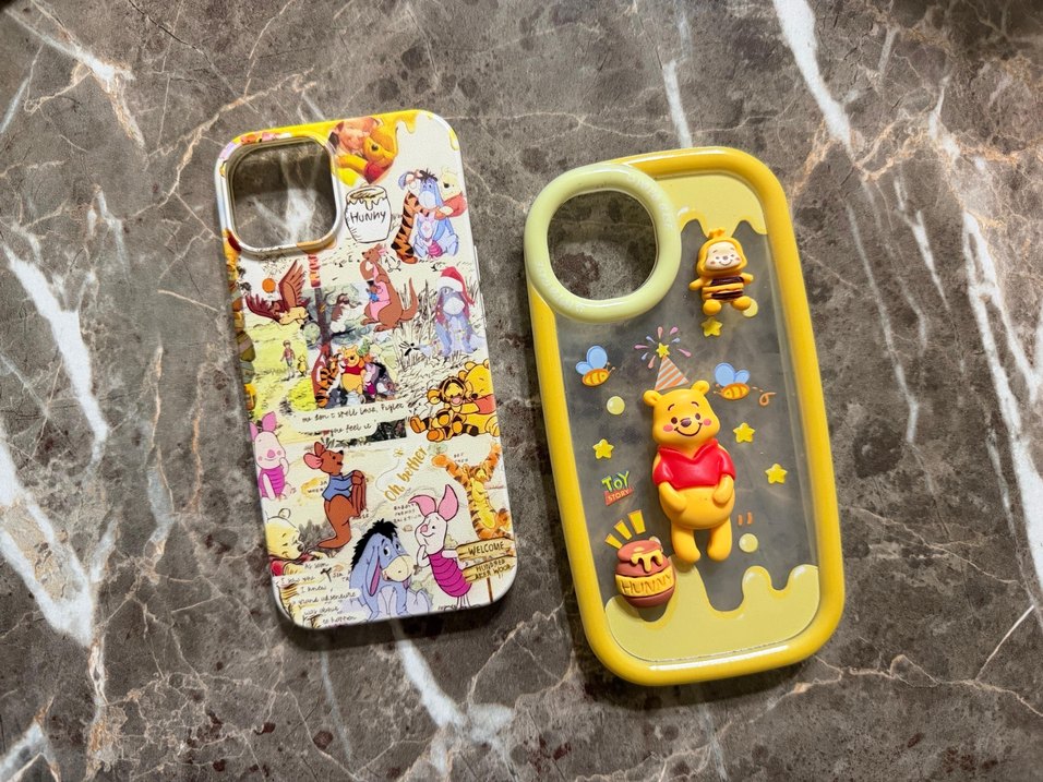 Boncuklu detaylara sahip, renkli sarı telefon kılıfları, pop kültür temalı eğlenceli karakterlerle süslenmiştir.