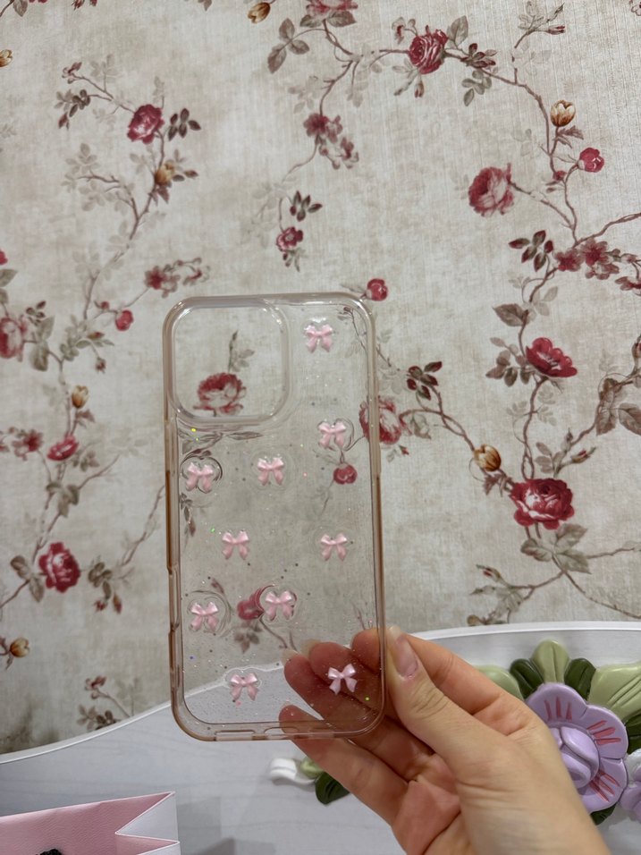 Pastel pembe renkte, küçük fiyonk detaylarıyla bohem tarzda telefon kılıfı. Telefonunuza zarif ve dekoratif bir görünüm sağlar.