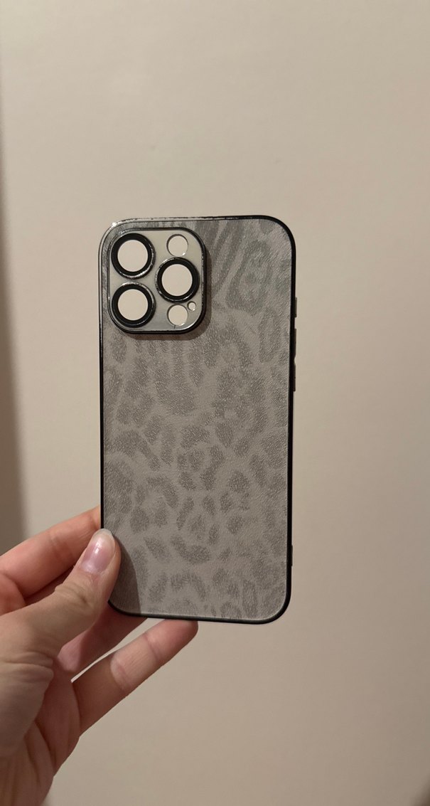 Bohem tarzda, gri leopar desenli ve parlak yüzeyli telefon kılıfı, telefonunuzu şık şekilde korur. iphone 16 pro max telefon kılıfı