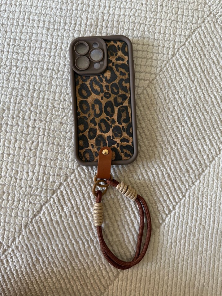 Kahverengi leopar desenli, bohem tarzda zincir detaylı telefon kılıfı. Kolay taşımak için bileklik kayışı bulunur.