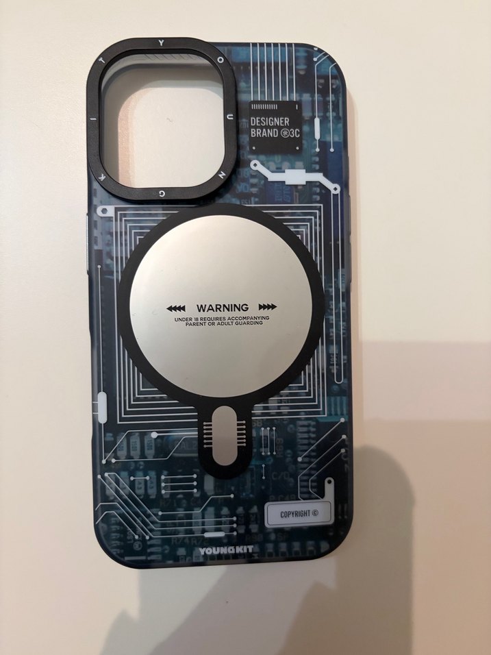 Düğmeli tasarıma sahip gri street wear telefon kılıfı, devre desenli ve marka ile uyarı etiketi içerir.