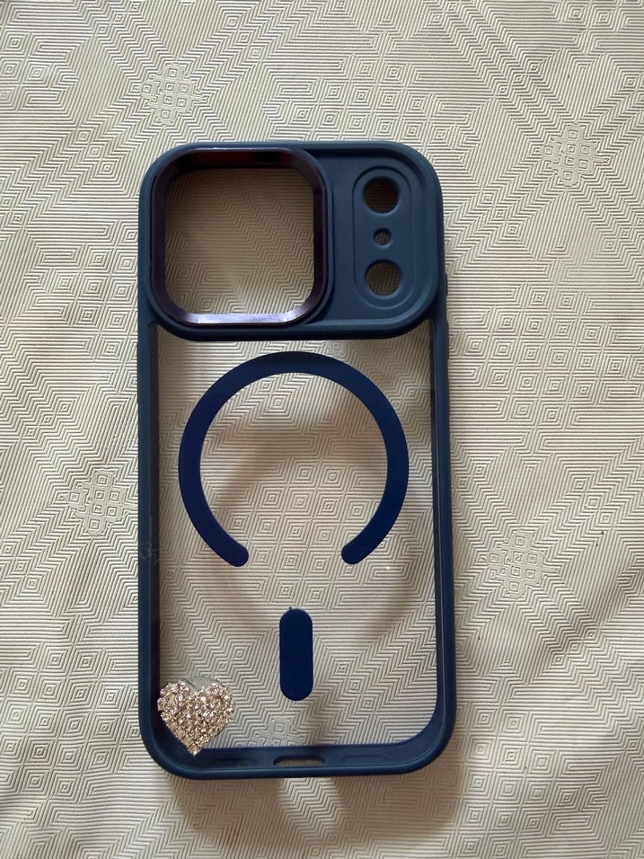 İphone 17 pro Lacivert renkte, düğmeli tasarıma sahip, şeffaf arka yüzeyli ve kalp detaylı bohem tarzda telefon kılıfı.