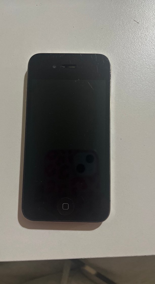Ön yüzünde tek bir ana ekran düğmesi bulunan koyu siyah renkli klasik tasarımlı iPhone. Ekranda kullanıma bağlı bazı izler var.