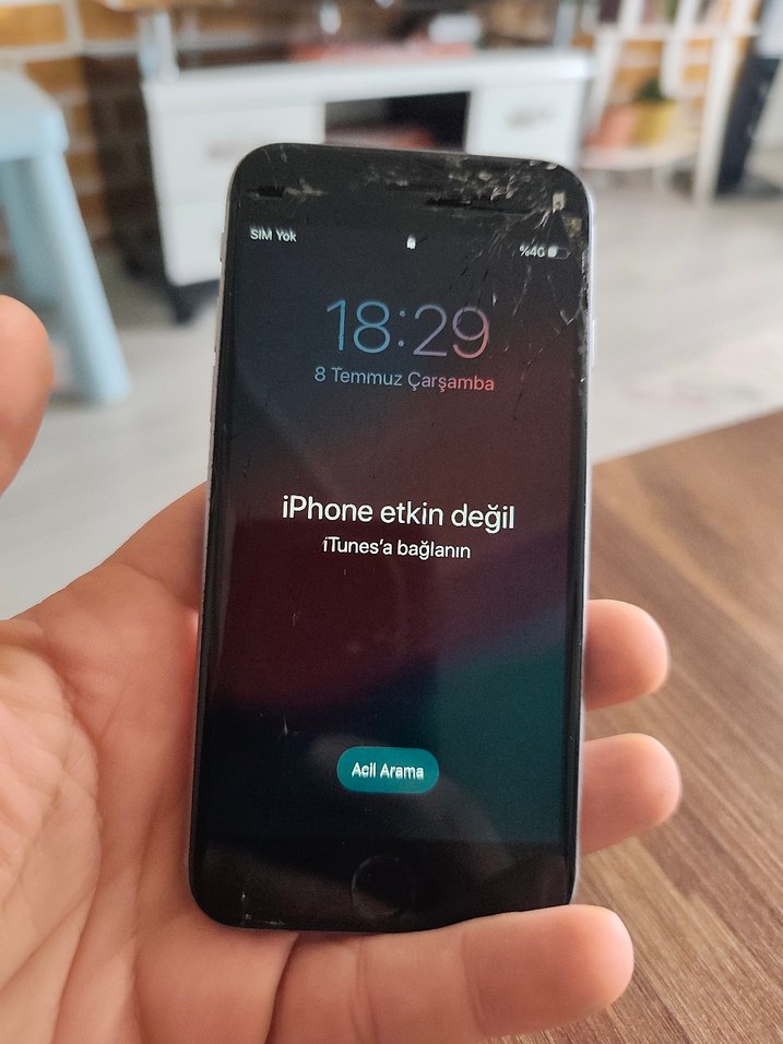 Kırık ekranlı koyu gri iPhone. Ekranda etkin değil uyarısı ve iTunes'a bağlanma hatası veriyor iCloud varmı yokmu bilmiyorum parça niyetine satılık pil durumu iyi iade kabul edilmemektedir ona göre alım yapalım lütfen