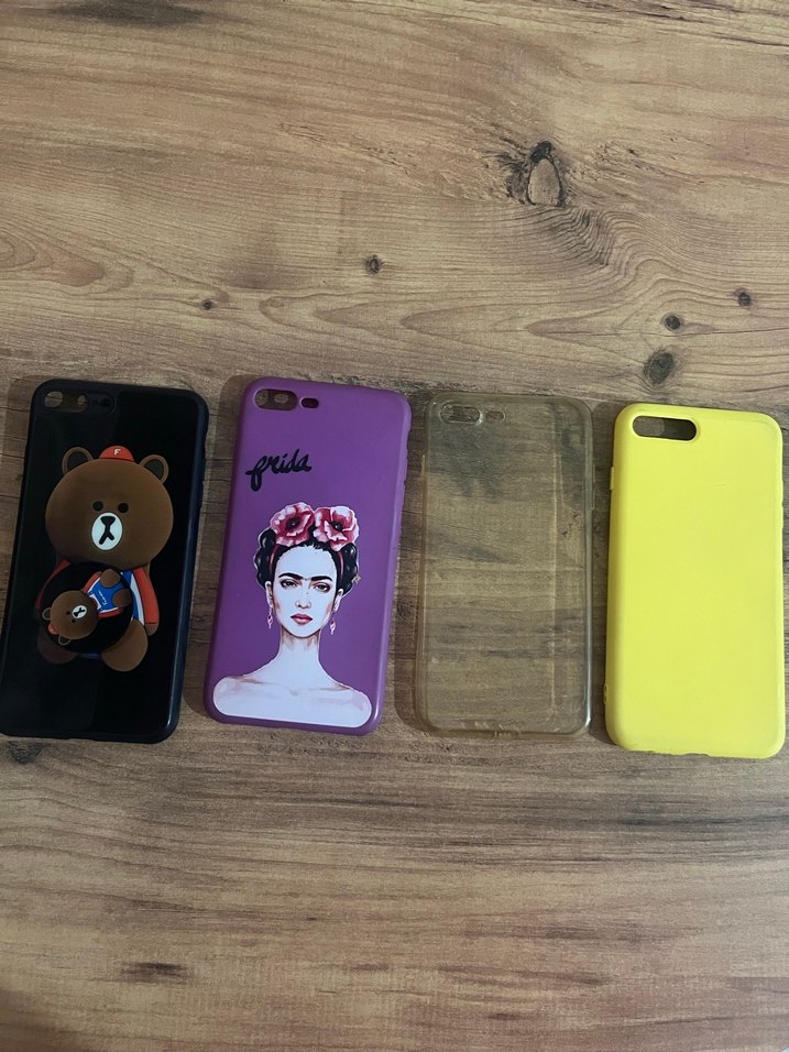 Çizgi film ve sanatsal baskılar ile çeşitli tasarımlara sahip renkli, parlak telefon kılıfları, ayrıca şeffaf ve sarı seçenekler içerir.