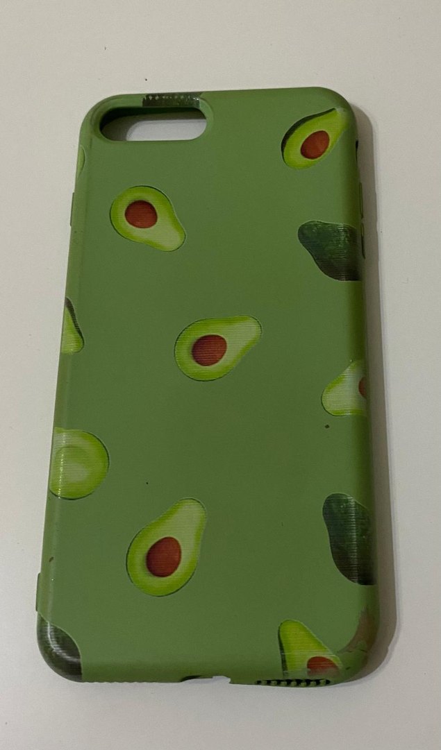 Parlak yüzeye sahip koyu yeşil telefon kılıfı, eğlenceli avokado desenleriyle pop kültür tarzı sunar.