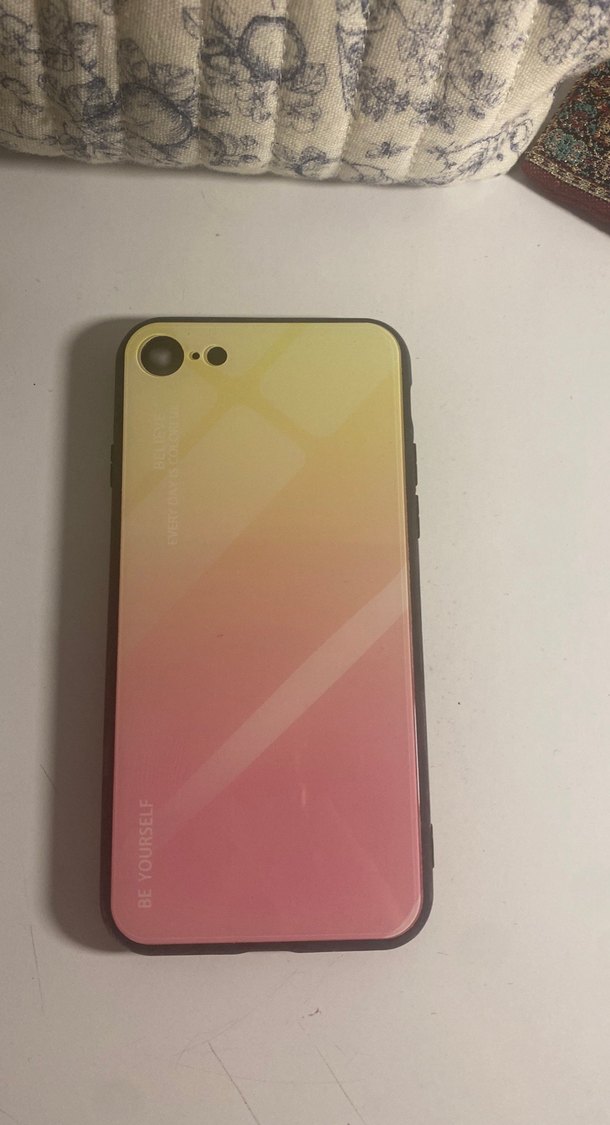 Parlak yüzeye sahip, sarıdan pembeye açık çok renkli geçişli, çağdaş tarzda telefon kapağı. Arkasında 'BE YOURSELF' yazısı bulunur.