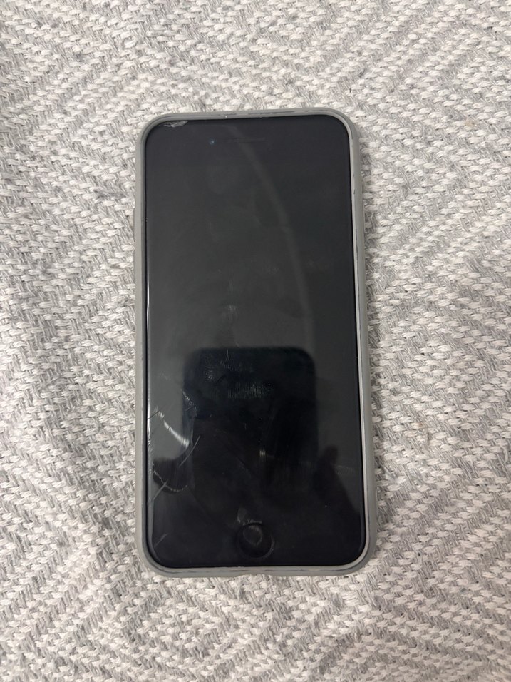 Ön ekranında küçük çizikler bulunan gri iPhone akıllı telefon. Cihazın ekran altında ana ekran düğmesi vardır.