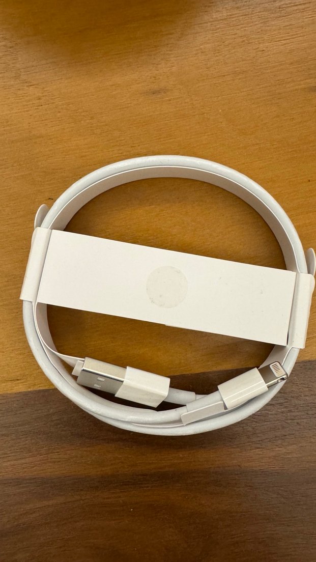 Sıfır orijinal Lightning bağlantı uçlarına sahip bej renkli telefon şarj kablosu, düzenli şekilde sarılmıştır.