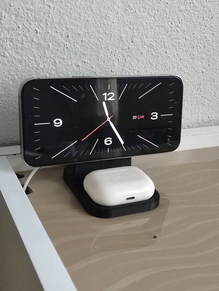 Gri ve beyaz renklerde, telefon ve kulaklıklar için kablosuz şarj standı. Şık ve kompakt tasarıma sahiptir.