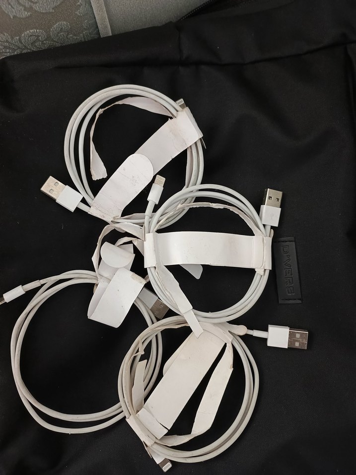 USB bağlantılı beyaz telefon şarj kabloları, apple cihazlara uyumludur. Kablolar düzenli şekilde sarılmış ve beyaz bantlarla sabitlenmiştir. tanesi 150 toplu alımda 4 tanesi 300 tl