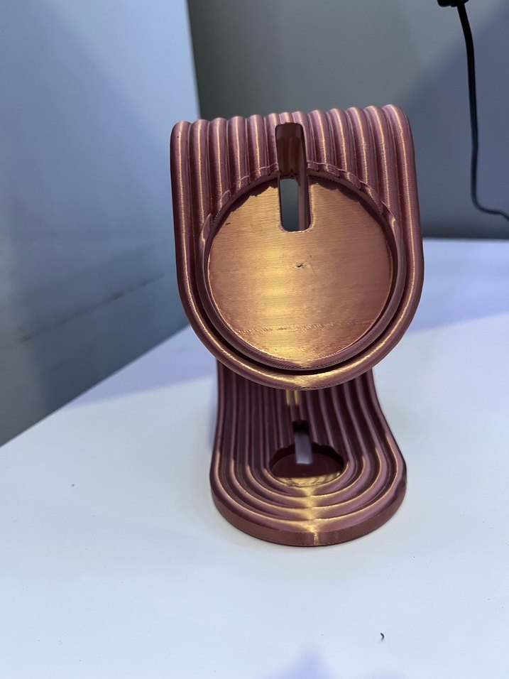 Parlak kahverengi telefon tutucu, kavisli ve kabartmalı tasarımıyla telefonunuzu güvenle tutar. Kompakt yapısı masanız için uygundur. 3D baskı