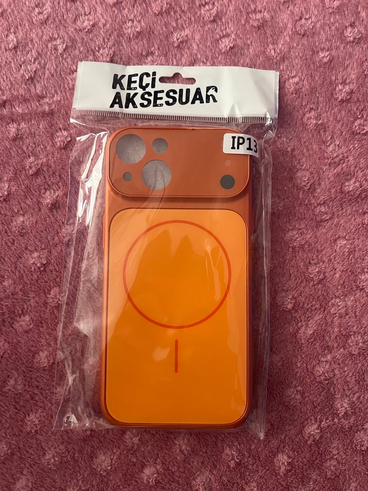 Turuncu renkli, velcro kapamalı street wear tarzı telefon kılıfı. IP13 modeline uygundur.