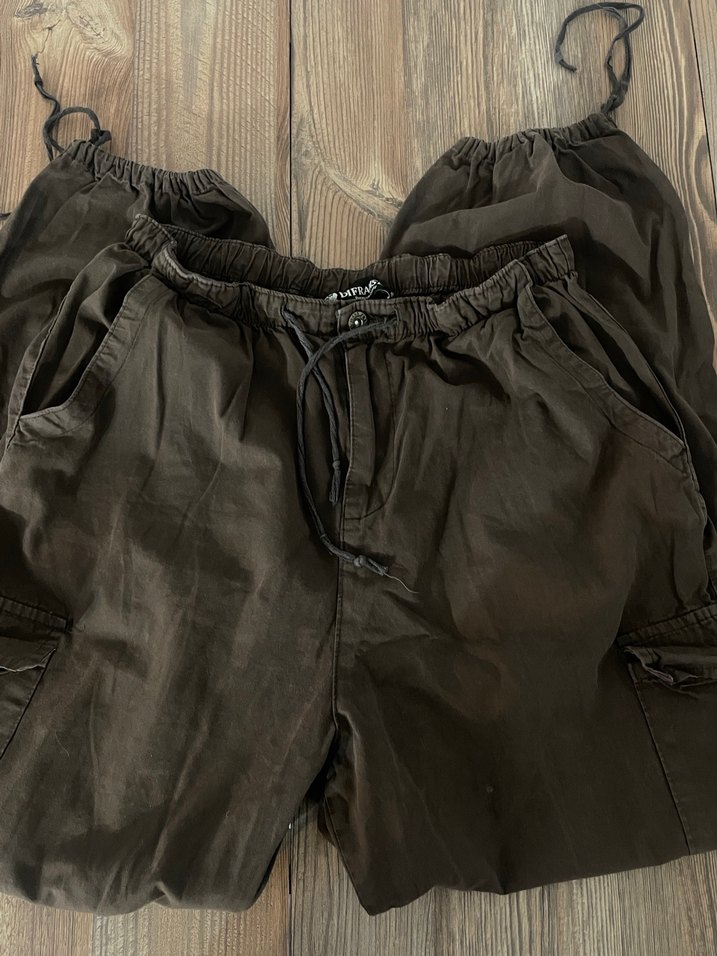 ip bağlama detaylı kahverengi keten tok kumaştan salaş kesim paraşüt pantolon sokak stiline uygun