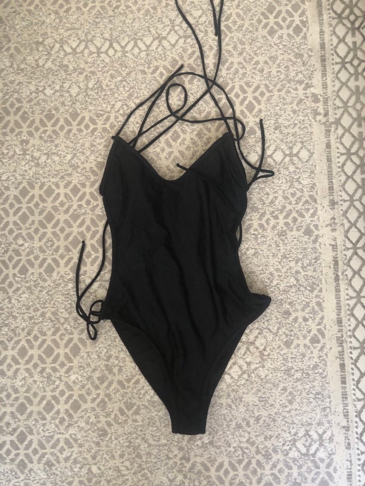 Siyah, ip detaylı, vücuda oturan kadın mayo. Minimalist tasarımı ve midi boyuyla plajda şık bir görünüm sağlar.Bir kez kullandım.