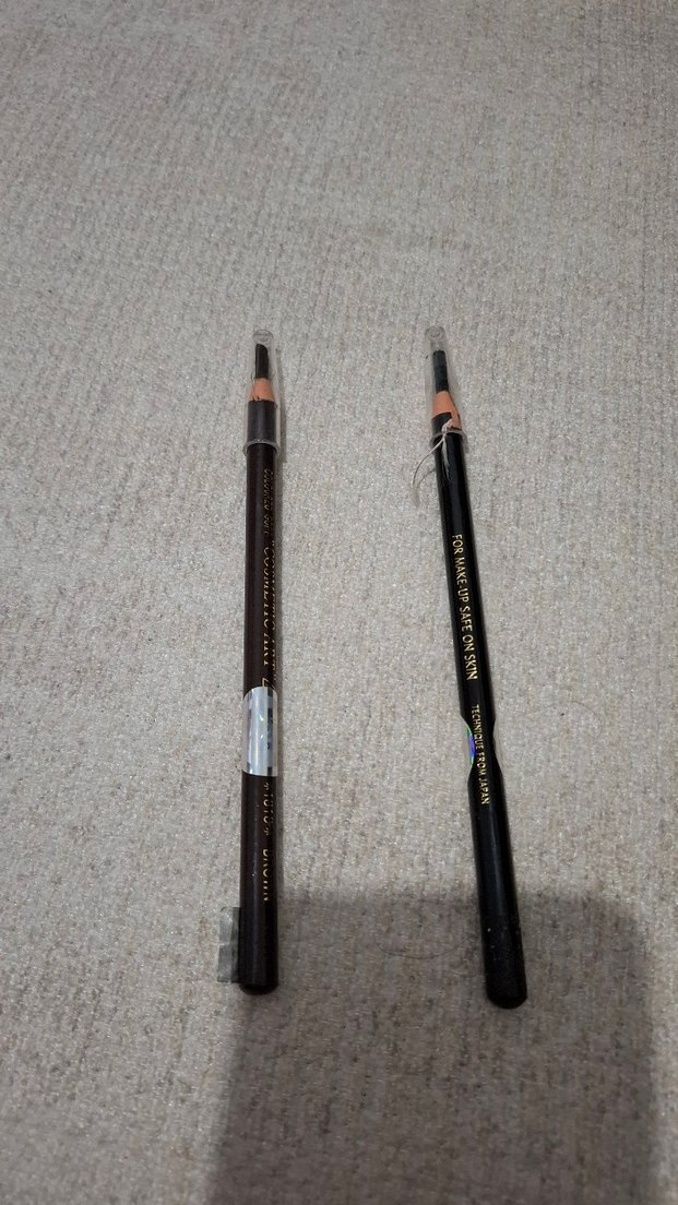 Siyah ve kahverengi renkte, yumuşak sürümlü iki adet kaş tasarım kalemi, şeffaf kapaklı. sadece eğitim için kullanıldı.