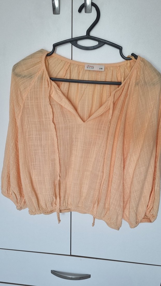 Düğmeli, V yaka, bej keten bluz. Salaş ve kısa kesimiyle bohem tarzını yansıtır. Sadece 1 kez giydim. çok iyi durumda