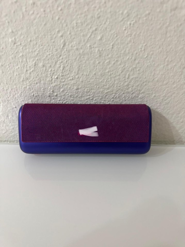 Koyu mor renkte, kompakt ve şık tasarımlı Bluetooth hoparlör. Kablosuz ses oynatma için taşınabilir ve kullanımı kolay.