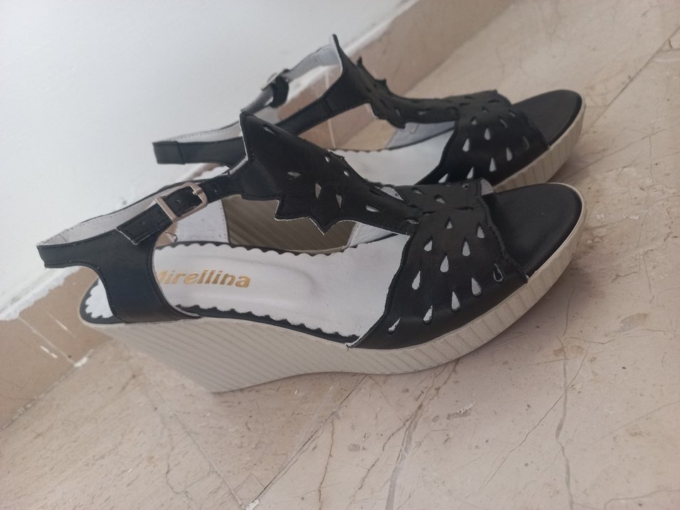 İrellina markalı siyah dolgu topuklu sandalet, bağcıklı kayış ve baskılı delikli tasarıma sahip, rahat günlük kullanım için uygundur.