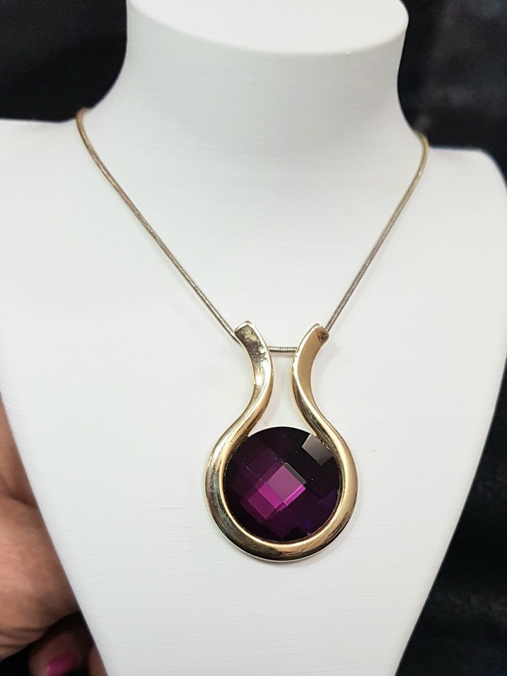 lale çerçeve içine yerleştirilmiş iri mor kristal uçlu çelik kadın kolye. retro. metal aksamı ve zinciri hafif gold tonda. papağan klips. kristal çap 2.2 cm, uç 4.4x3.2 cm, zincir 40+8 cm.