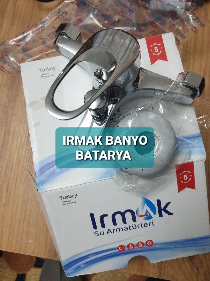 Irmak markasına ait krom kaplama banyo bataryası, montaj parçalarıyla birlikte ve 5 yıl garanti ile Türkiye'de üretilmiştir.
