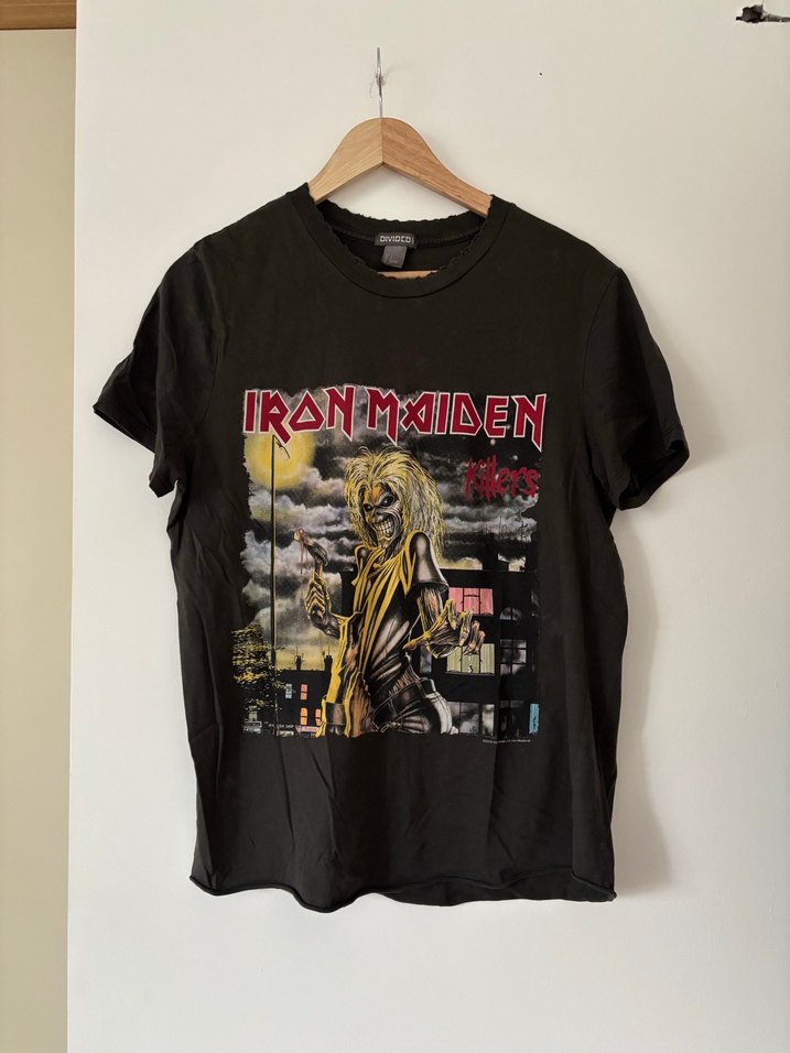 Siyah pamuklu tişört, bol kesim, kısa kollu ve yuvarlak yakalıdır. Üzerinde Iron Maiden baskısı vardır, rock punk tarzı için uygundur.