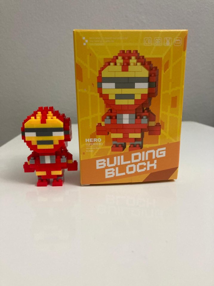 Küçük parçalarla oluşturulmuş, kırmızı ve sarı renklerde renkli Lego süper kahraman figürü. Kutusunda 'Building Block' yazısı bulunur.