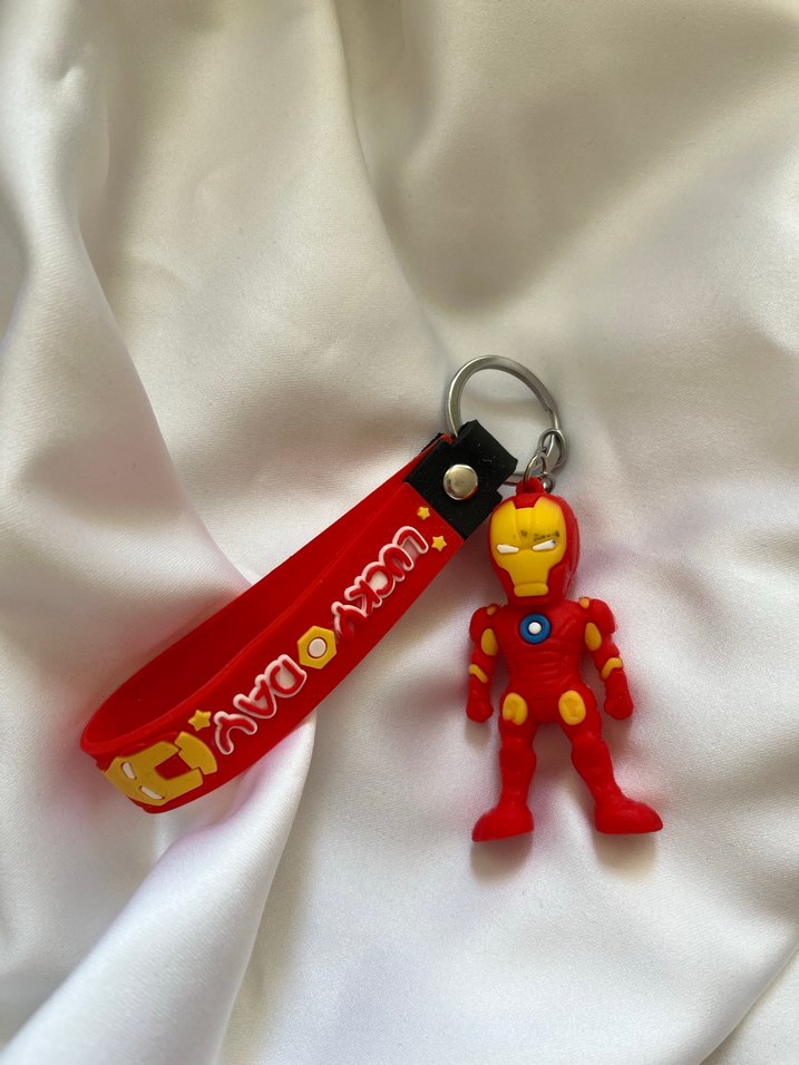 Elastik kırmızı bant ve cesur pop kültür demir adam figürlü renkli anahtarlık. Minimalist tarzı canlı detaylarla birleştirir.