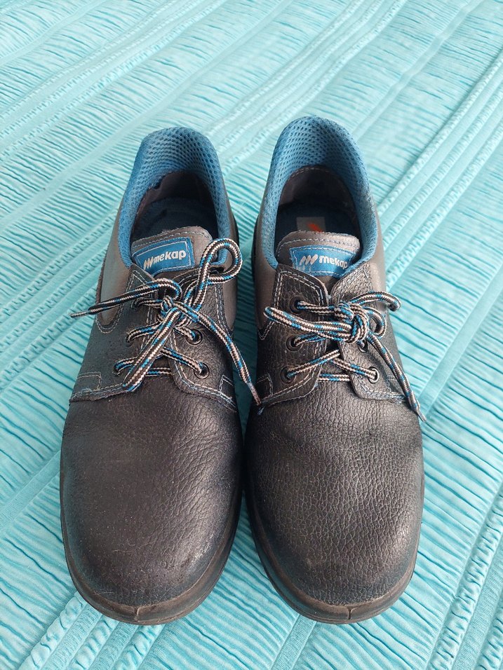 Mavi ve gri bağcıklı, dokulu yüzeye sahip burnu çelik iş ayakkabısı. defosu sorunu yok.300 tl