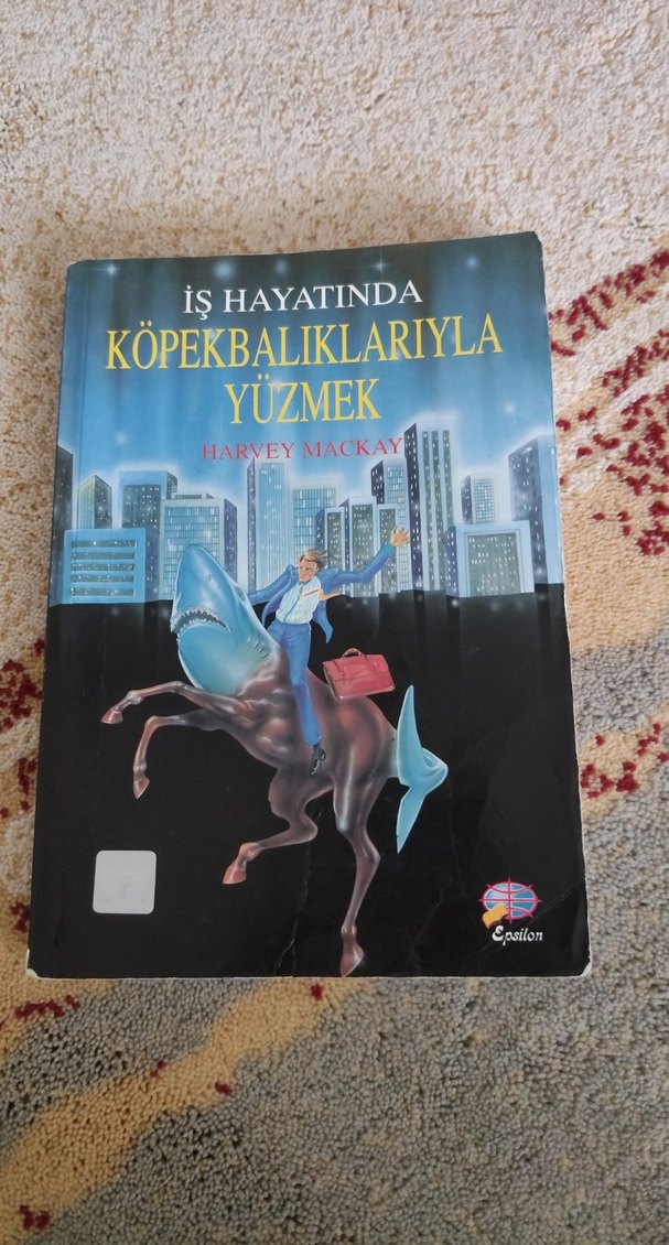 Harvey Mackay'in yazdığı "İş Hayatında Köpekbalıklarıyla Yüzmek" kitabı, iş dünyasında başarılı olma stratejilerini anlatıyor. Kapakta şehir manzarası önünde köpekbalığı ve at karışımı bir yaratık üzerinde bir adam var.