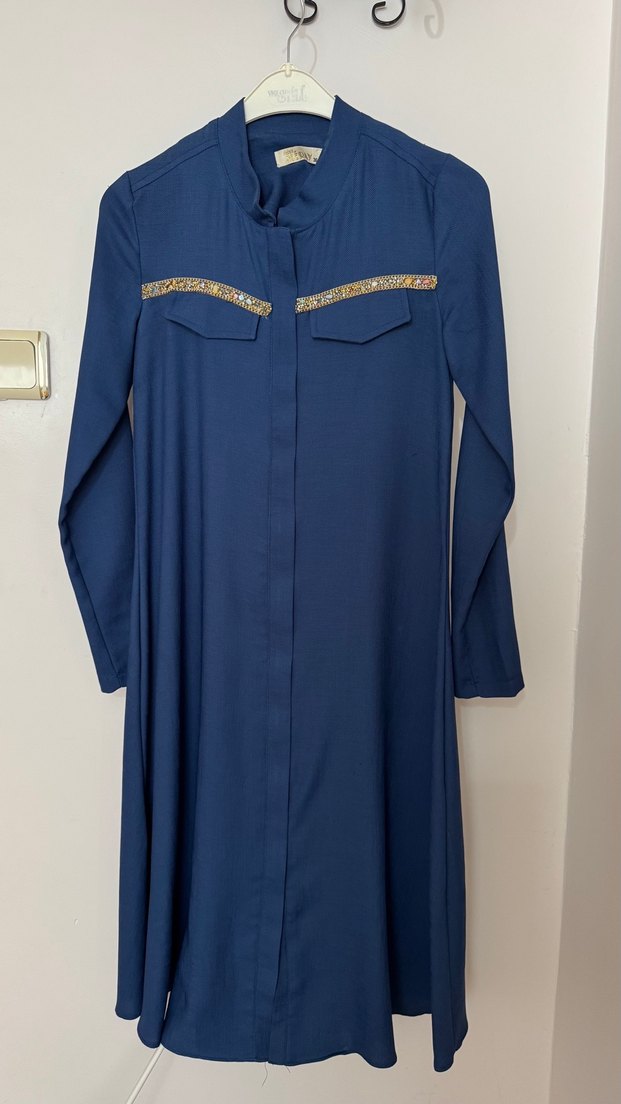 İş için Mavi Uzun Kollu Nakışlı Tunik